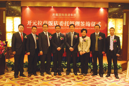 右三為西藏國際旅游集團董事長唐世珍,右五為西藏國際旅游集團總經理張金慶,右四為集團董事長陳妙林,右六為開元酒店管理公司總經理侯峰